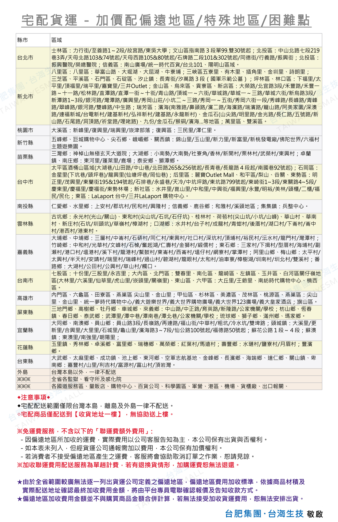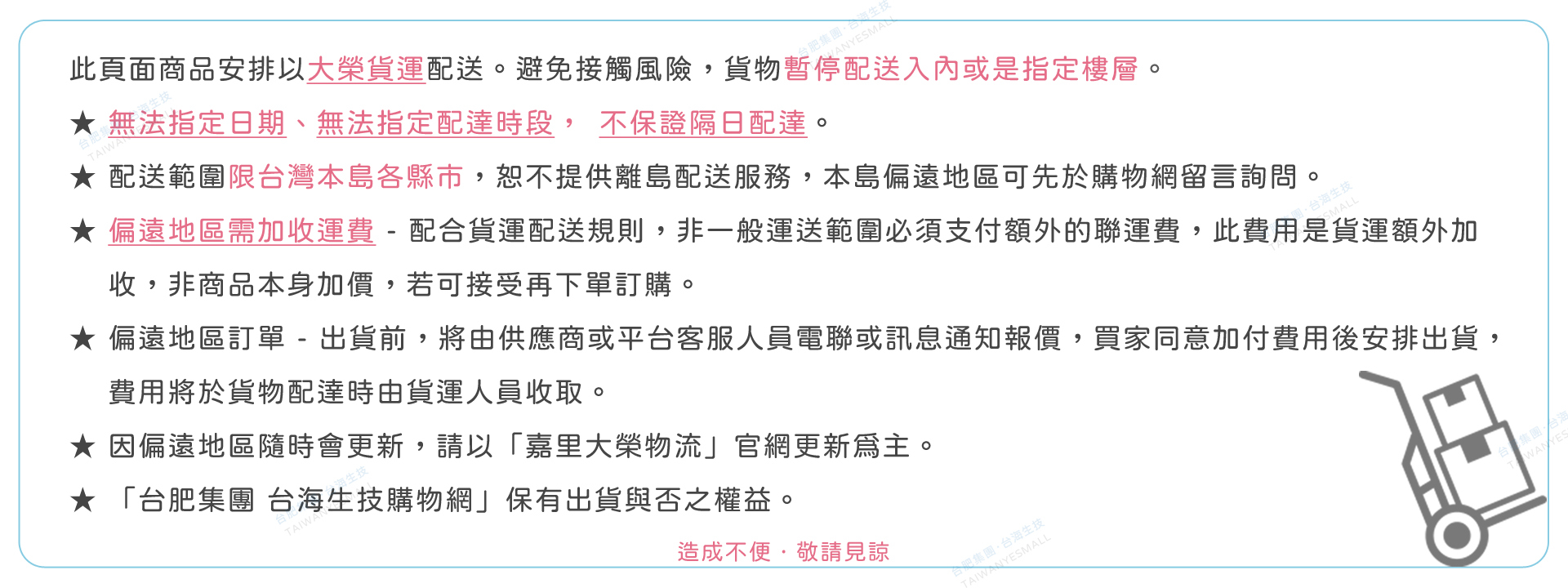 ★ 此商品以大榮貨運配送,配合貨運配送規則,非一般運送範圍必須支付額外的聯運費,此費用是貨運額外加收,非商品本身加價,同意再下單,造成不便,敬請見諒。